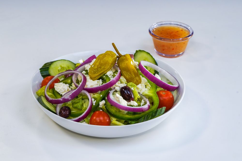 Mixed lettuce, green pepper, tomato wedges, red onion, cucumbers, kalamata olives, Pepperoncini and feta cheese, served with a side of house dressing.